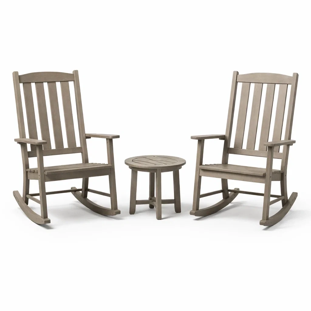 Ensemble comprenant deux fauteuils à bascule et une table en bois d'acacia, couleur grise.