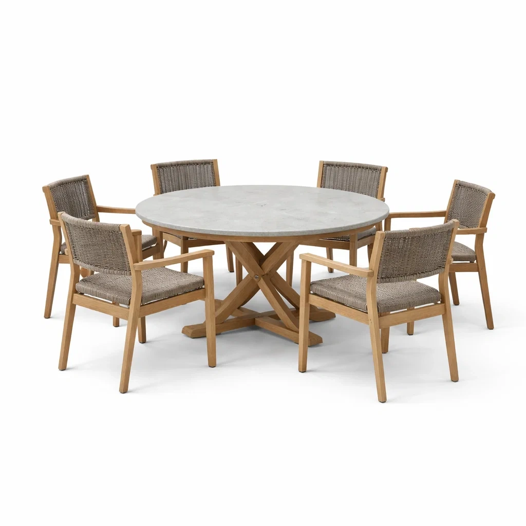 Table ronde avec un plateau en composite de pierre et une base en bois de chêne massif. Six chaises avec une structure en chêne et une assise en corde tressée en polyéthylène.
