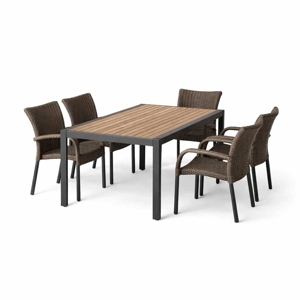 L'ensemble comprend une table rectangulaire et six chaises, adapté pour l'extérieur.